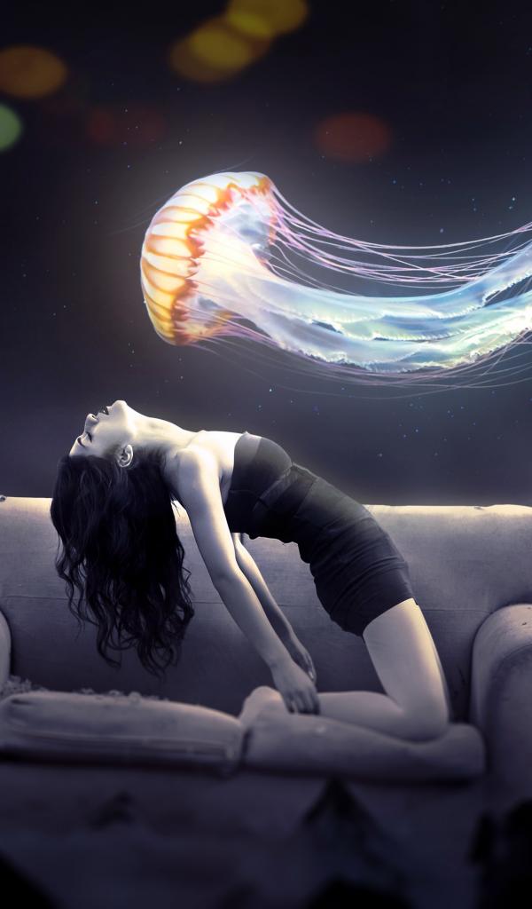 Wallpaper Medusa flies over a girl on a sofa, fantasy