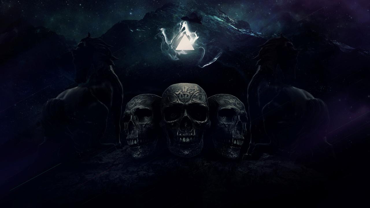 Wallpaper Three skulls on a background of mountains with horses, fantasy