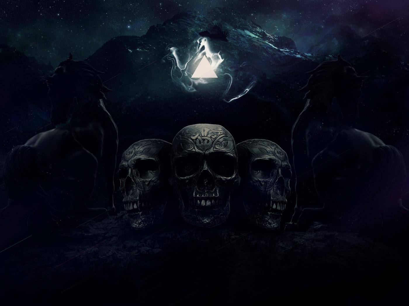 Wallpaper Three skulls on a background of mountains with horses, fantasy