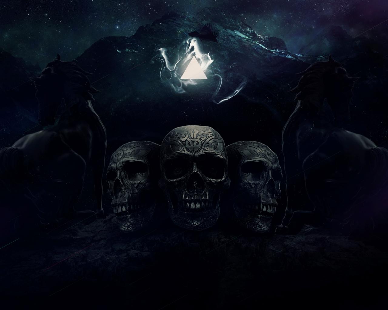 Wallpaper Three skulls on a background of mountains with horses, fantasy