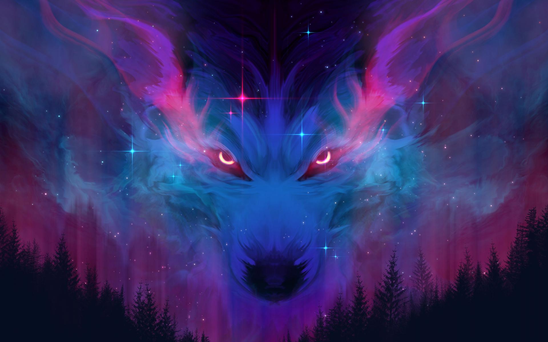 Wallpaper Neon wolf in the clouds above the forest