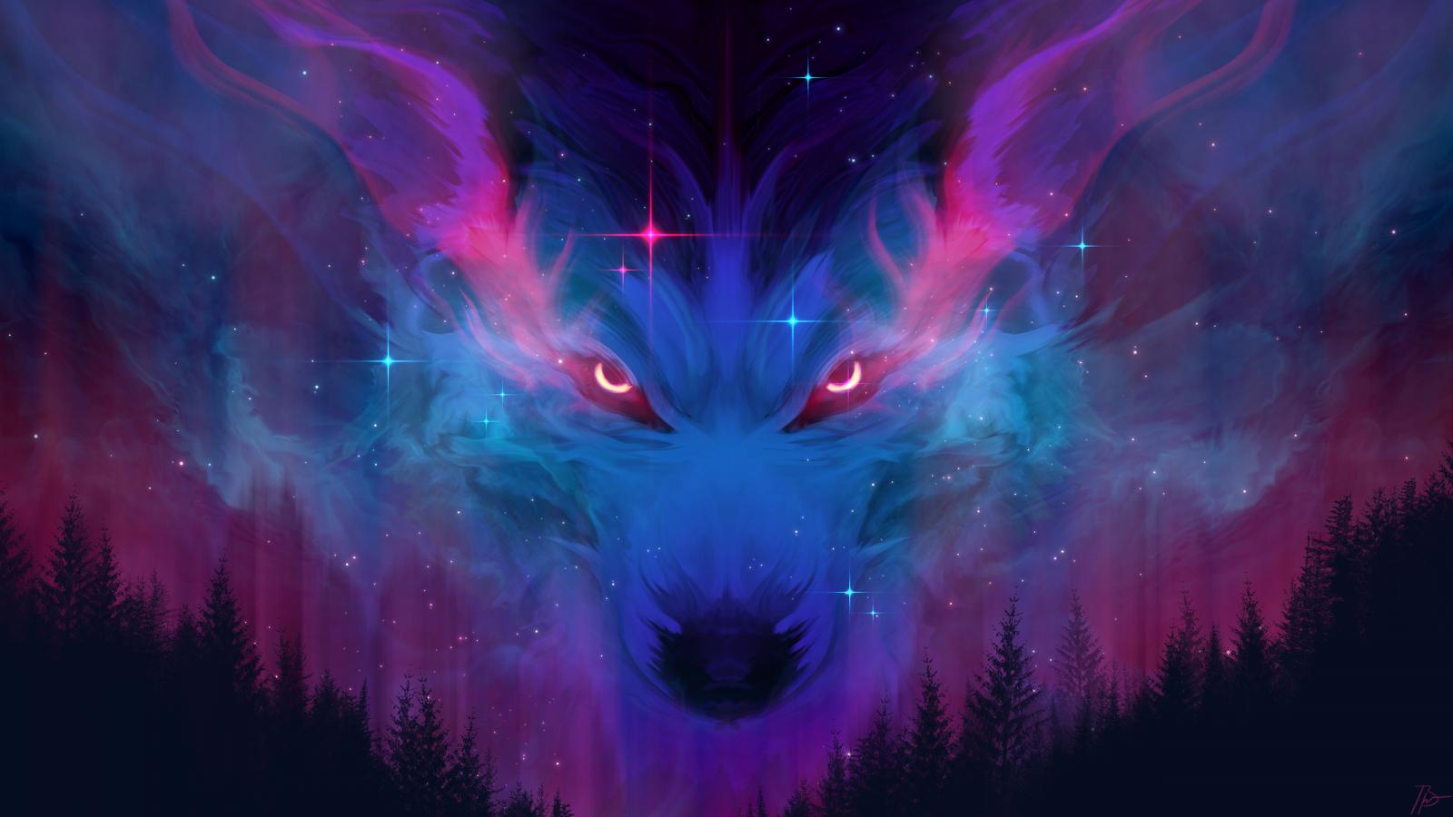 Wallpaper Neon wolf in the clouds above the forest