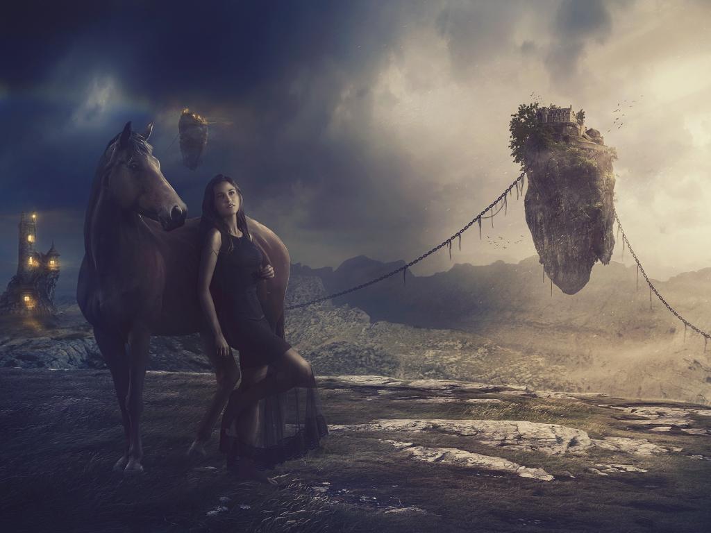 Wallpaper Girl in a black dress with a horse on a fantastic planet