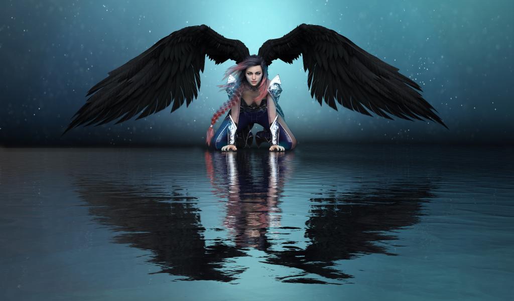 Wallpaper Fantastic girl angel with black wings is reflected in the water