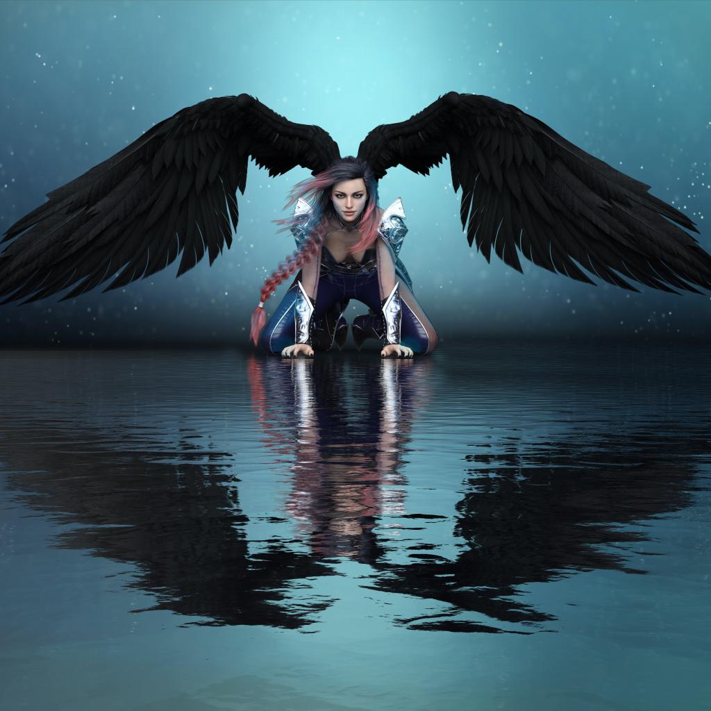 Wallpaper Fantastic girl angel with black wings is reflected in the water