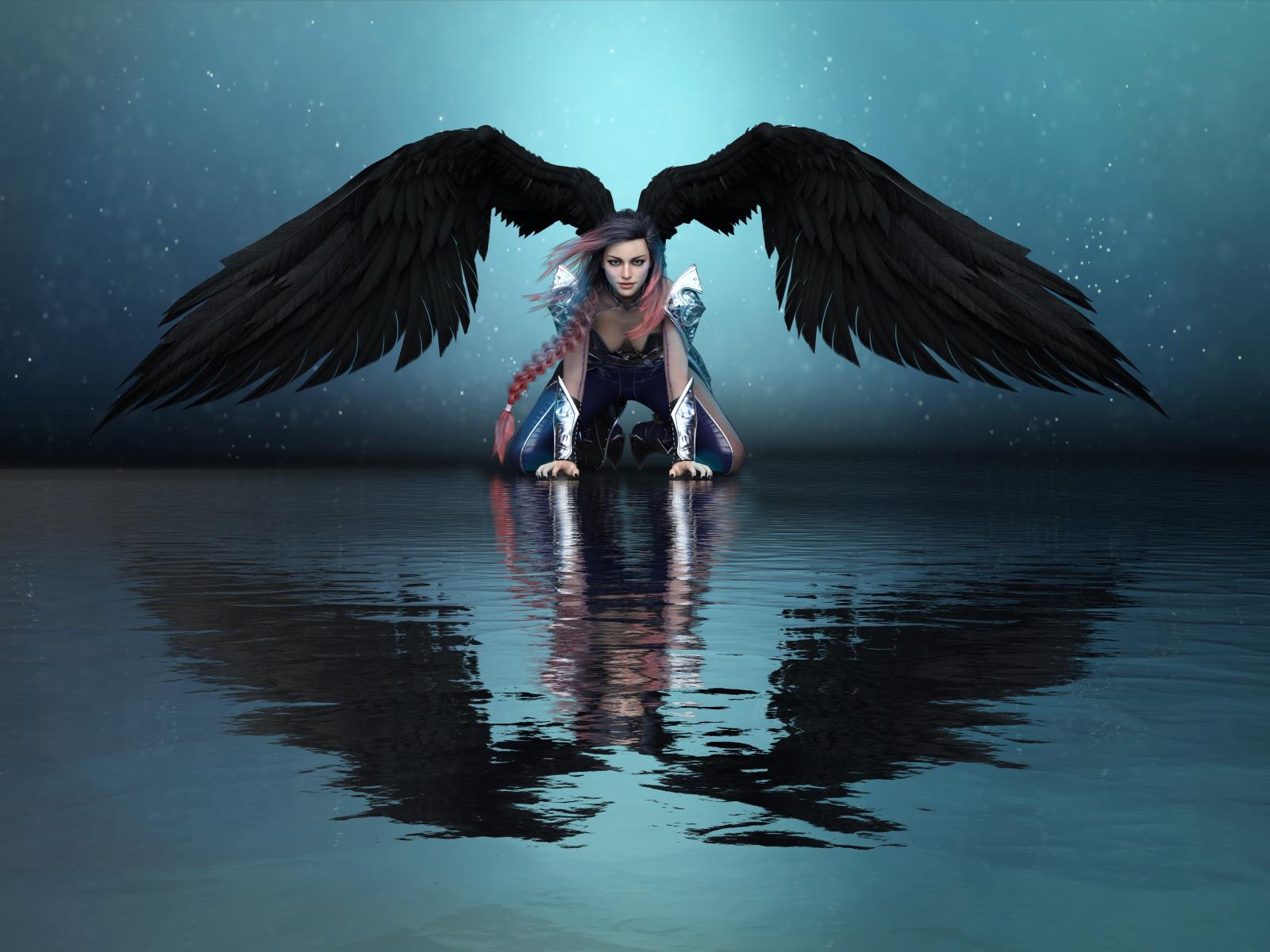 Wallpaper Fantastic girl angel with black wings is reflected in the water