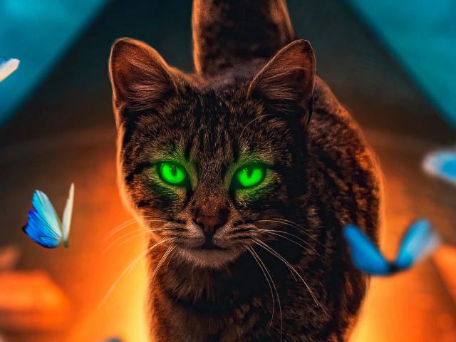 Wallpaper Gray green-eyed cat with butterflies