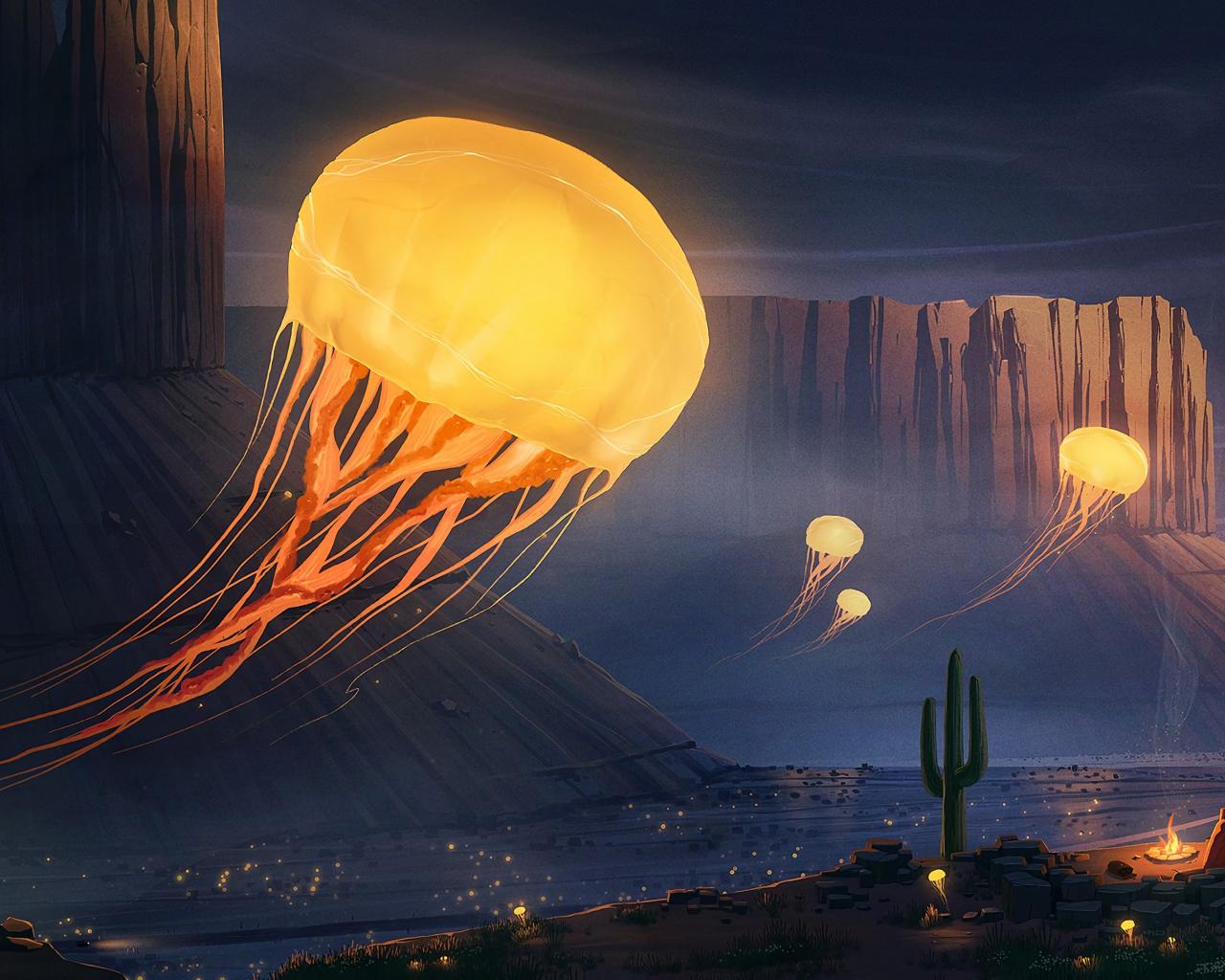 Wallpaper Fantastic fire jellyfish in the mountains