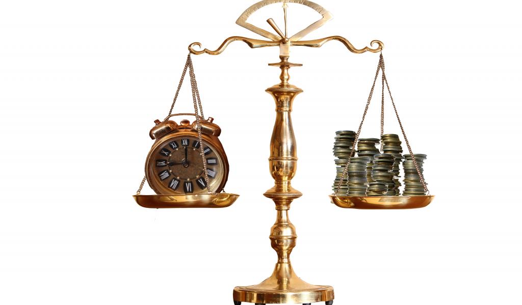 Wallpaper Scales with a clock and coins on the bowls
