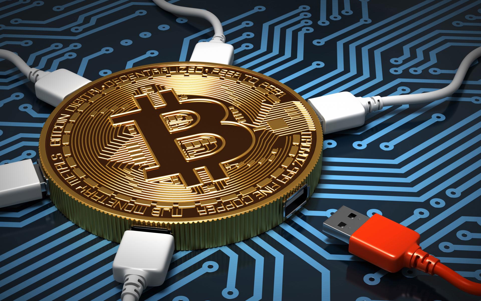 Wallpaper USB cable connected to bitcoin coin
