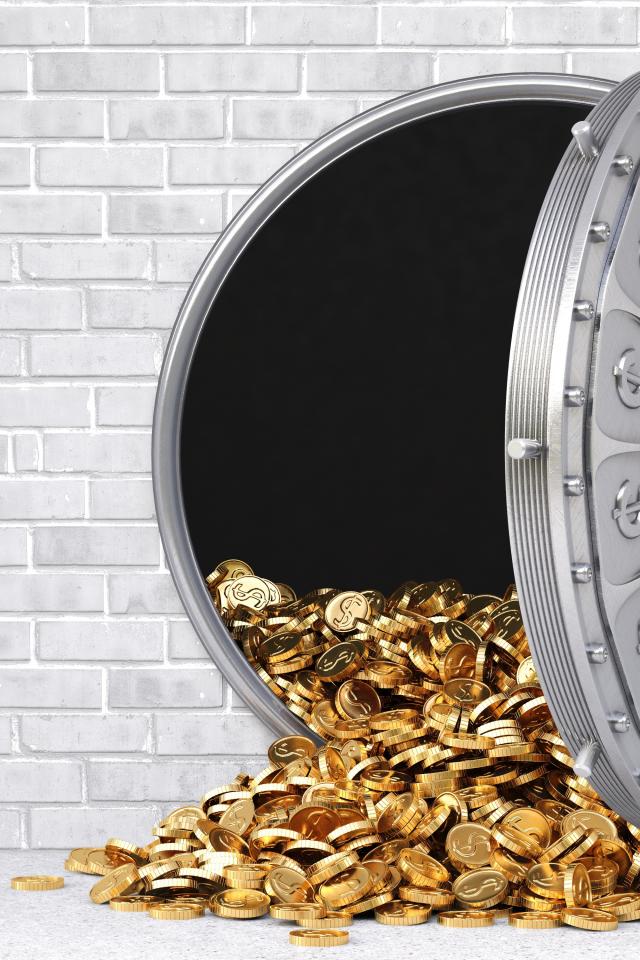 Wallpaper Gold coins fall out of the safe in a gray wall