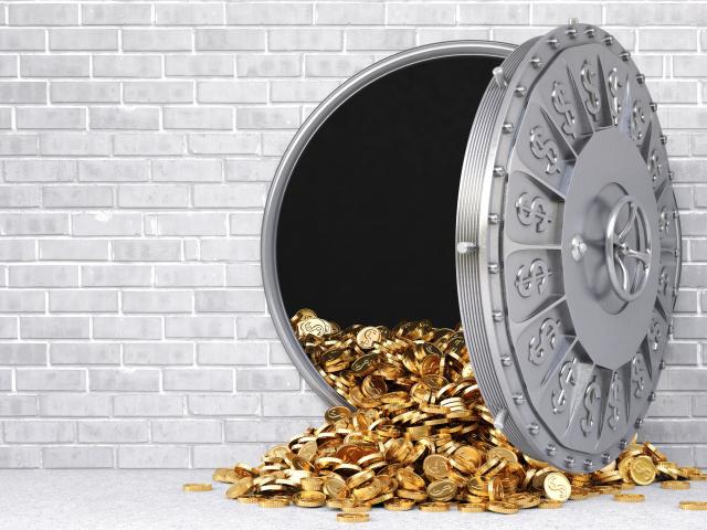 Wallpaper Gold coins fall out of the safe in a gray wall