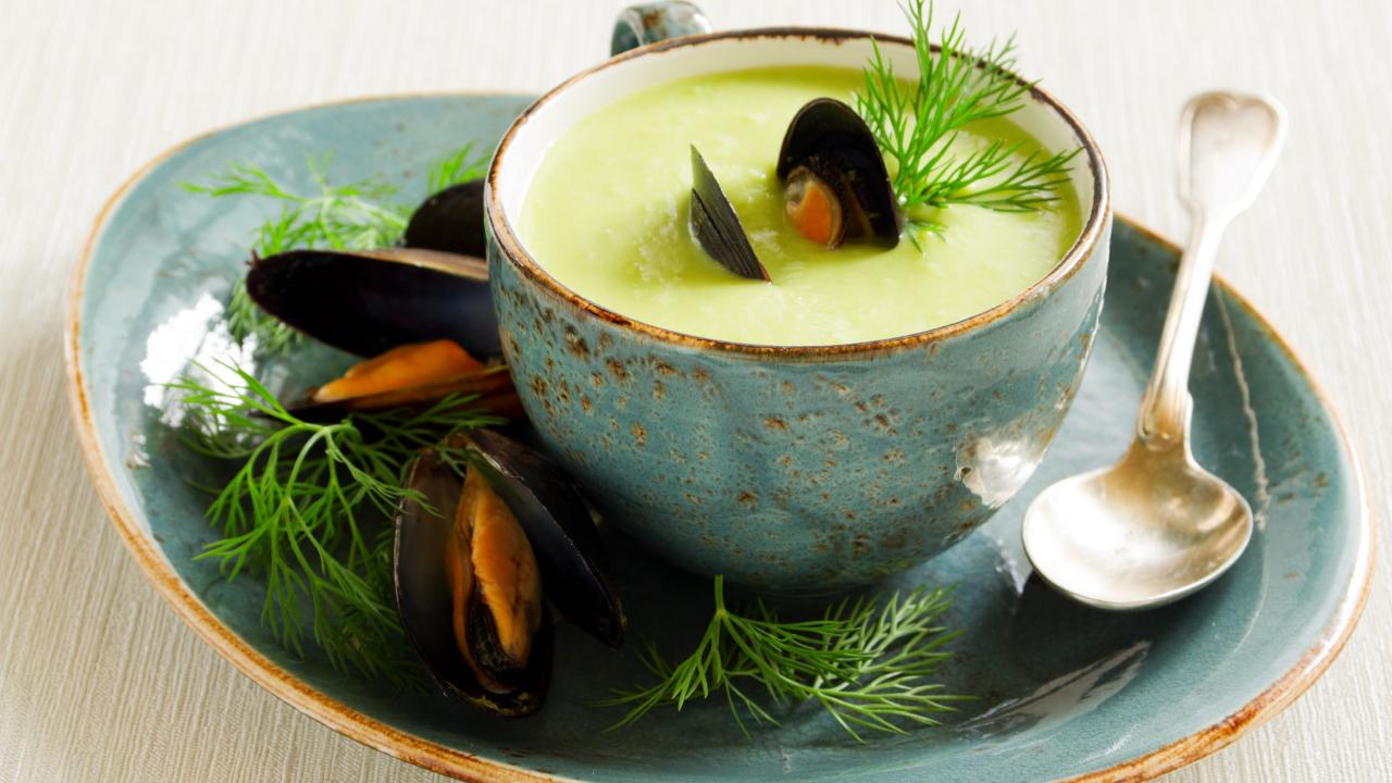 Wallpaper Soup of mussels in a soup cup