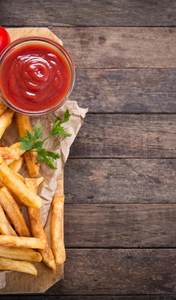 Wallpaper French fries, hamburger, cola and tomatoes on the table