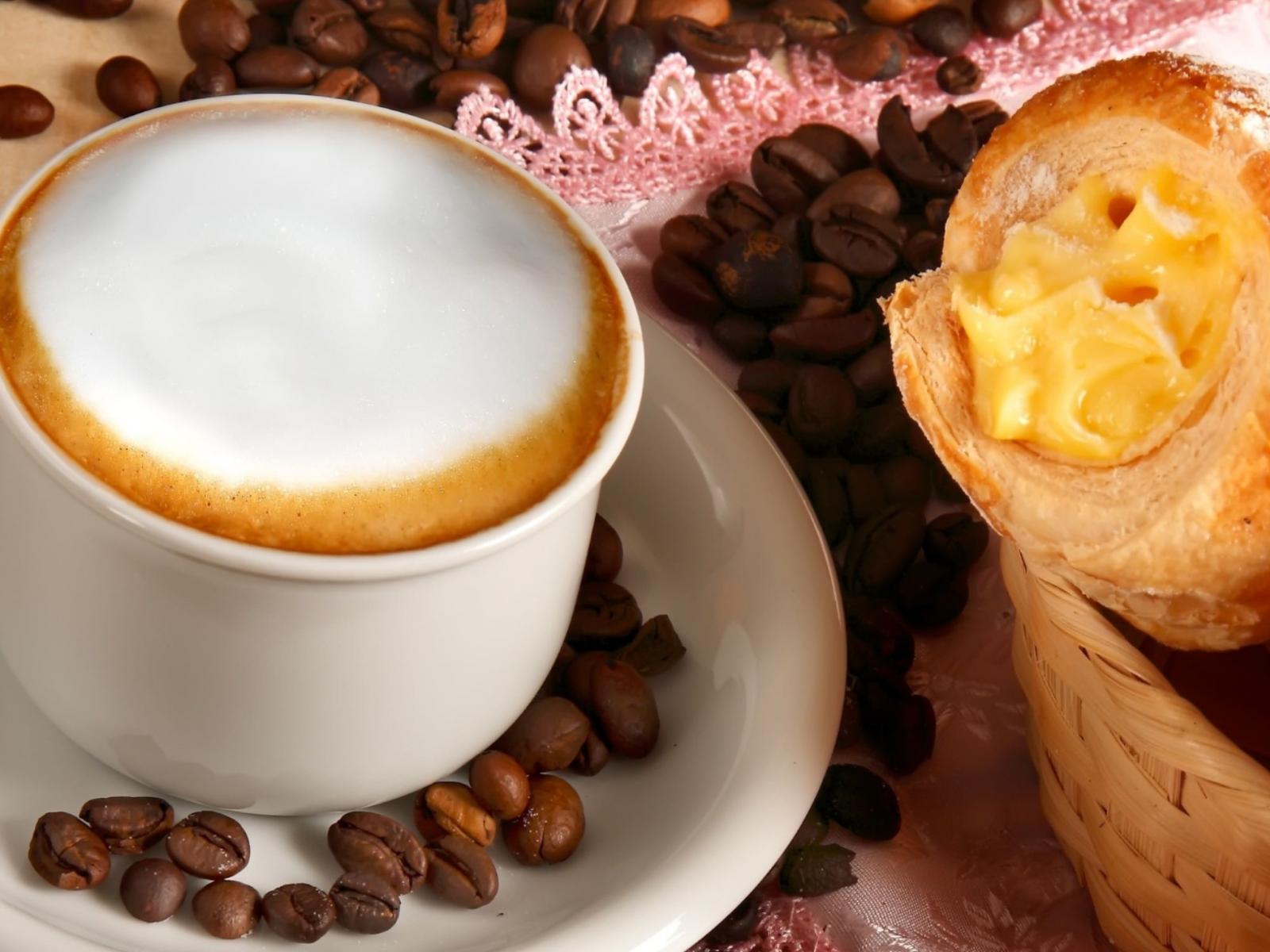 Wallpaper White cup of coffee with croissant
