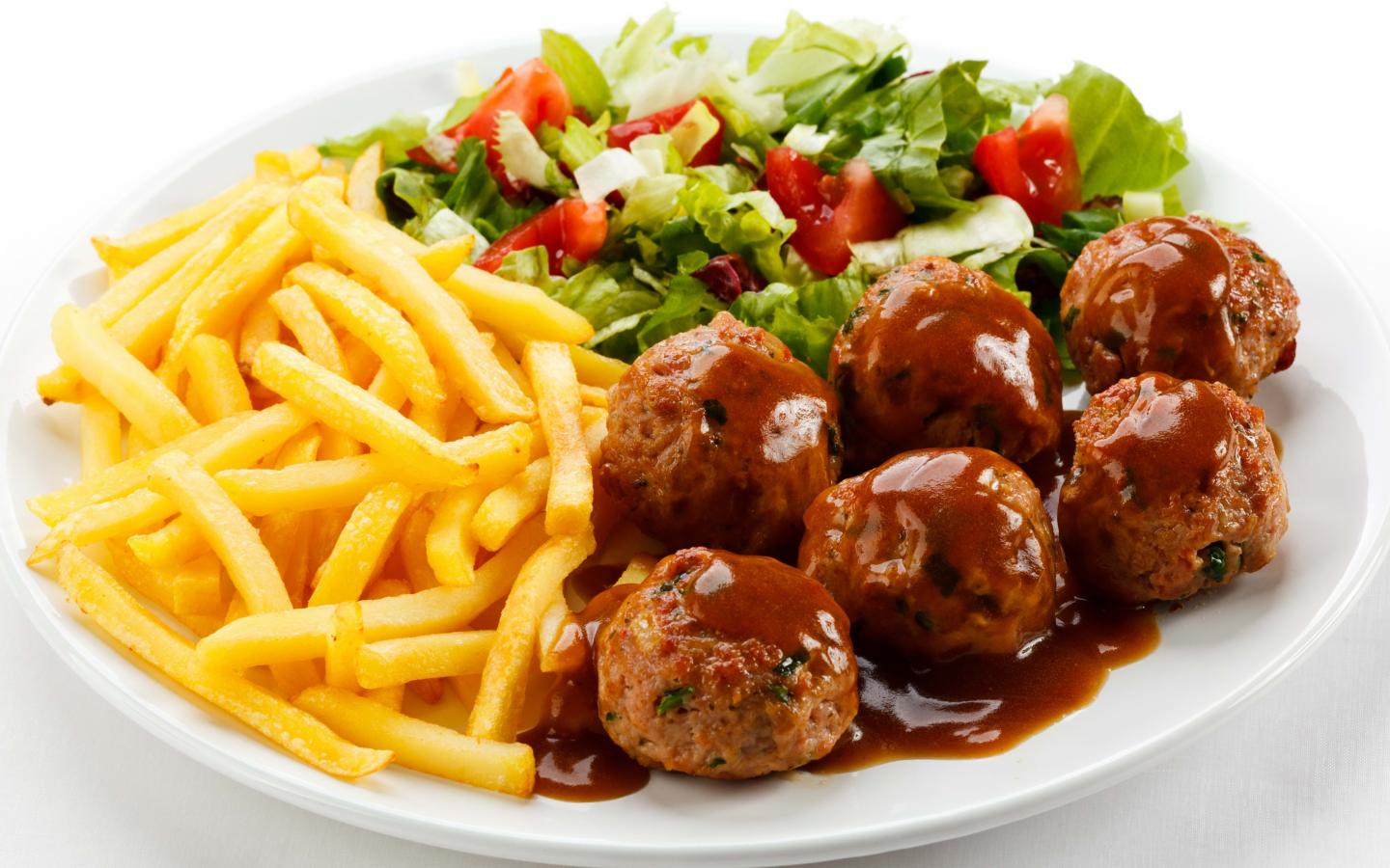 Wallpaper French fries on a white plate with salad and meatballs