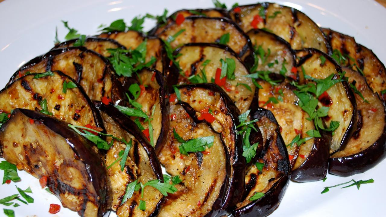 Wallpaper Appetizing fried eggplant on a plate with greens