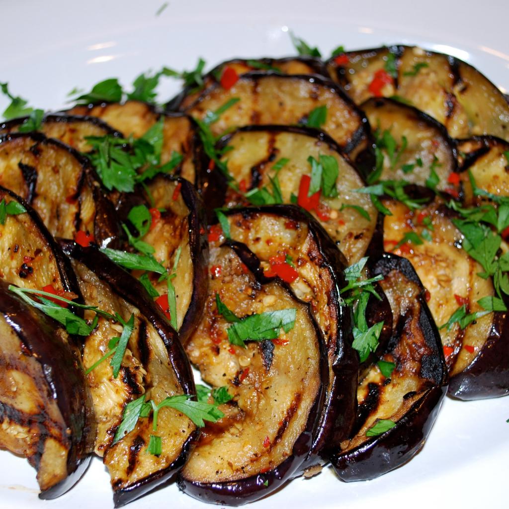 Wallpaper Appetizing fried eggplant on a plate with greens
