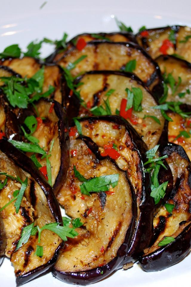 Wallpaper Appetizing fried eggplant on a plate with greens