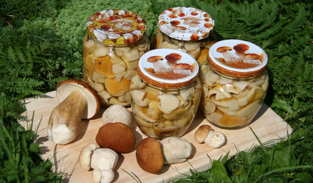 Wallpaper Canned mushrooms in jars on a cutting board with fresh