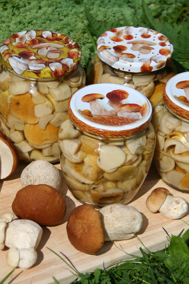 Wallpaper Canned mushrooms in jars on a cutting board with fresh