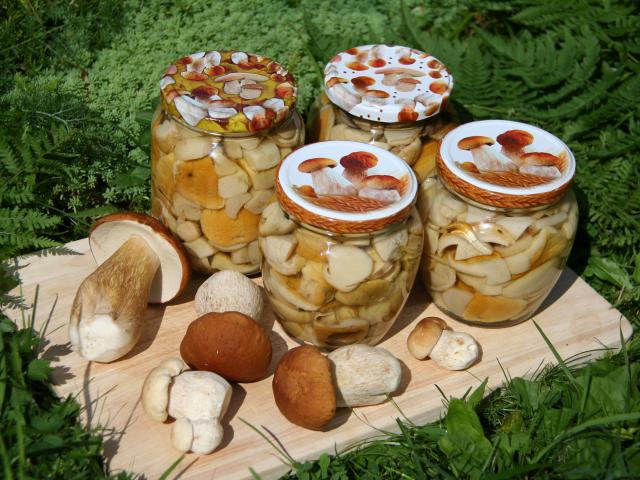 Wallpaper Canned mushrooms in jars on a cutting board with fresh