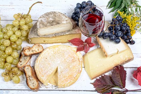 Wallpaper Dear cheese with mold on the table with grapes and red wine