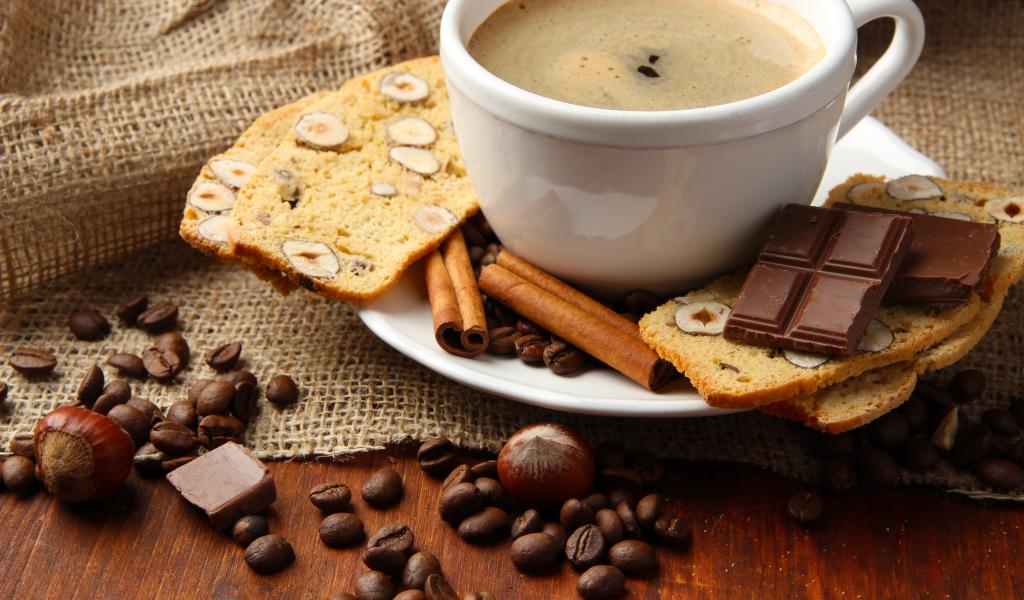 Wallpaper A cup of coffee with pastries, coffee beans and chocolate