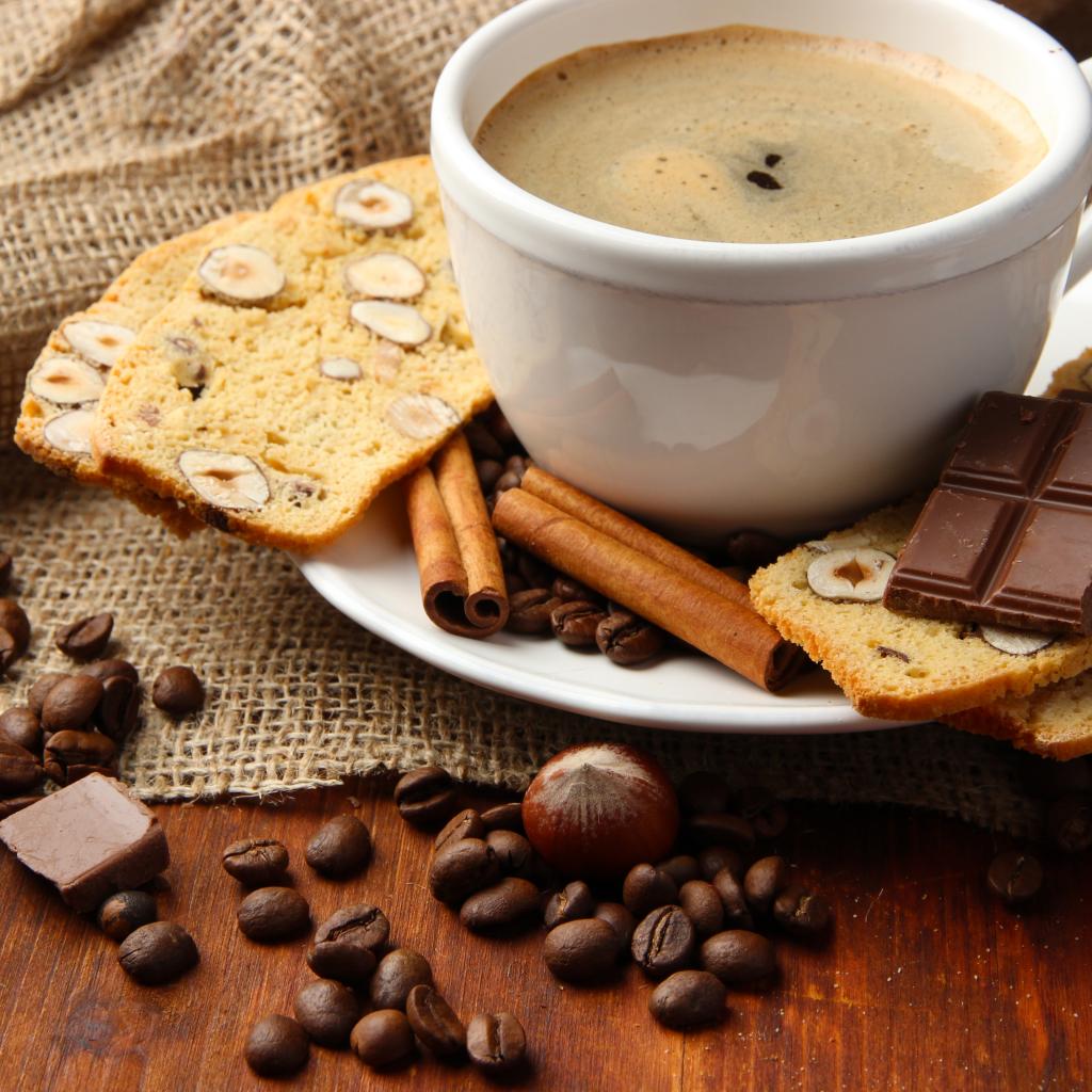Wallpaper A cup of coffee with pastries, coffee beans and chocolate