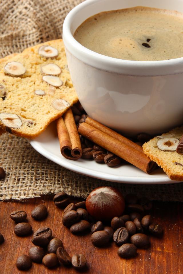 Wallpaper A cup of coffee with pastries, coffee beans and chocolate