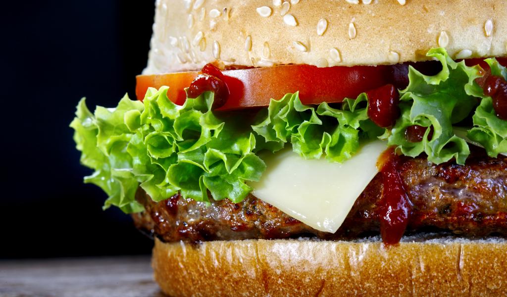 Wallpaper Delicious juicy hamburger on a board with french fries and sauce