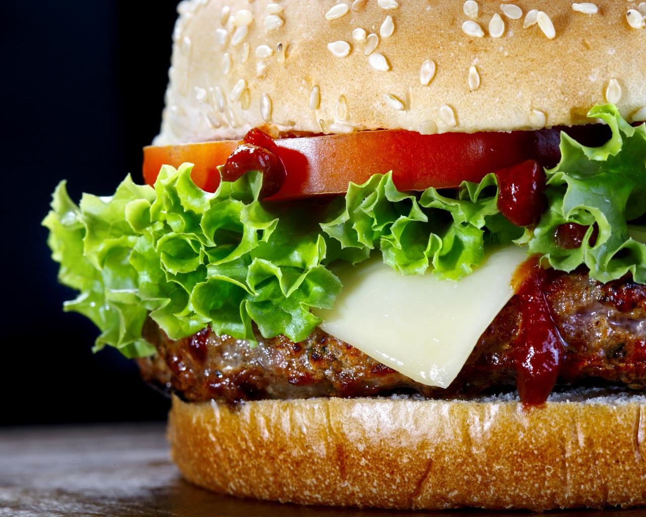 Wallpaper Delicious juicy hamburger on a board with french fries and sauce