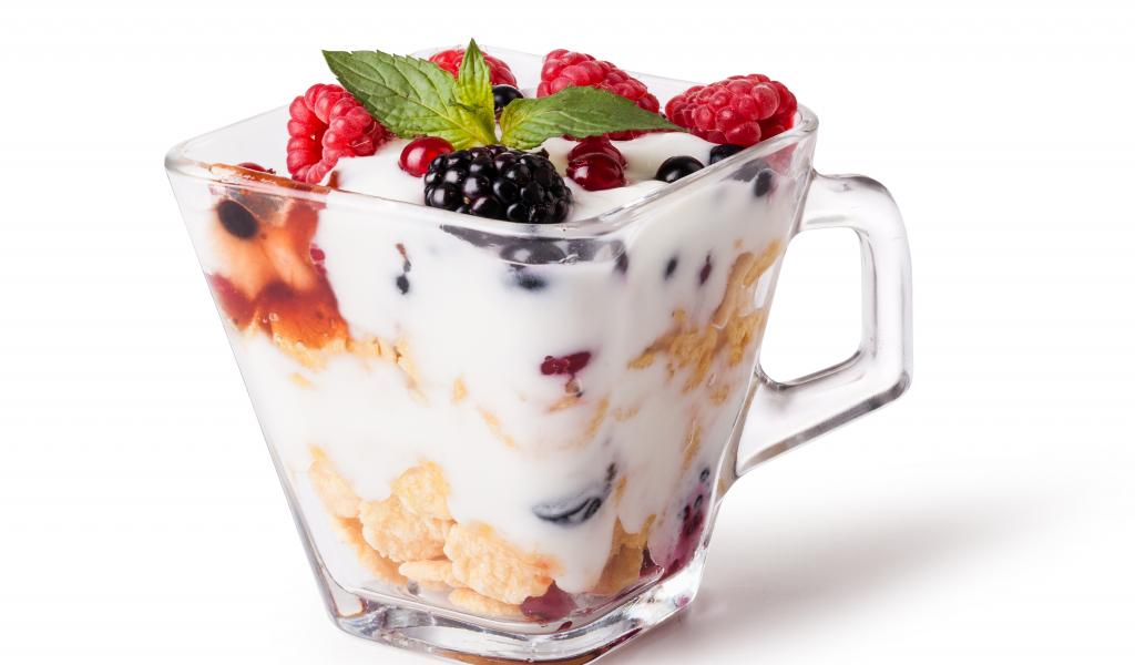Wallpaper Flakes with yogurt and berries in a glass on a white background