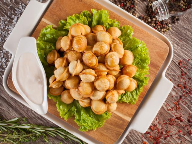 Wallpaper Dumplings with sauce and lettuce on a cutting board