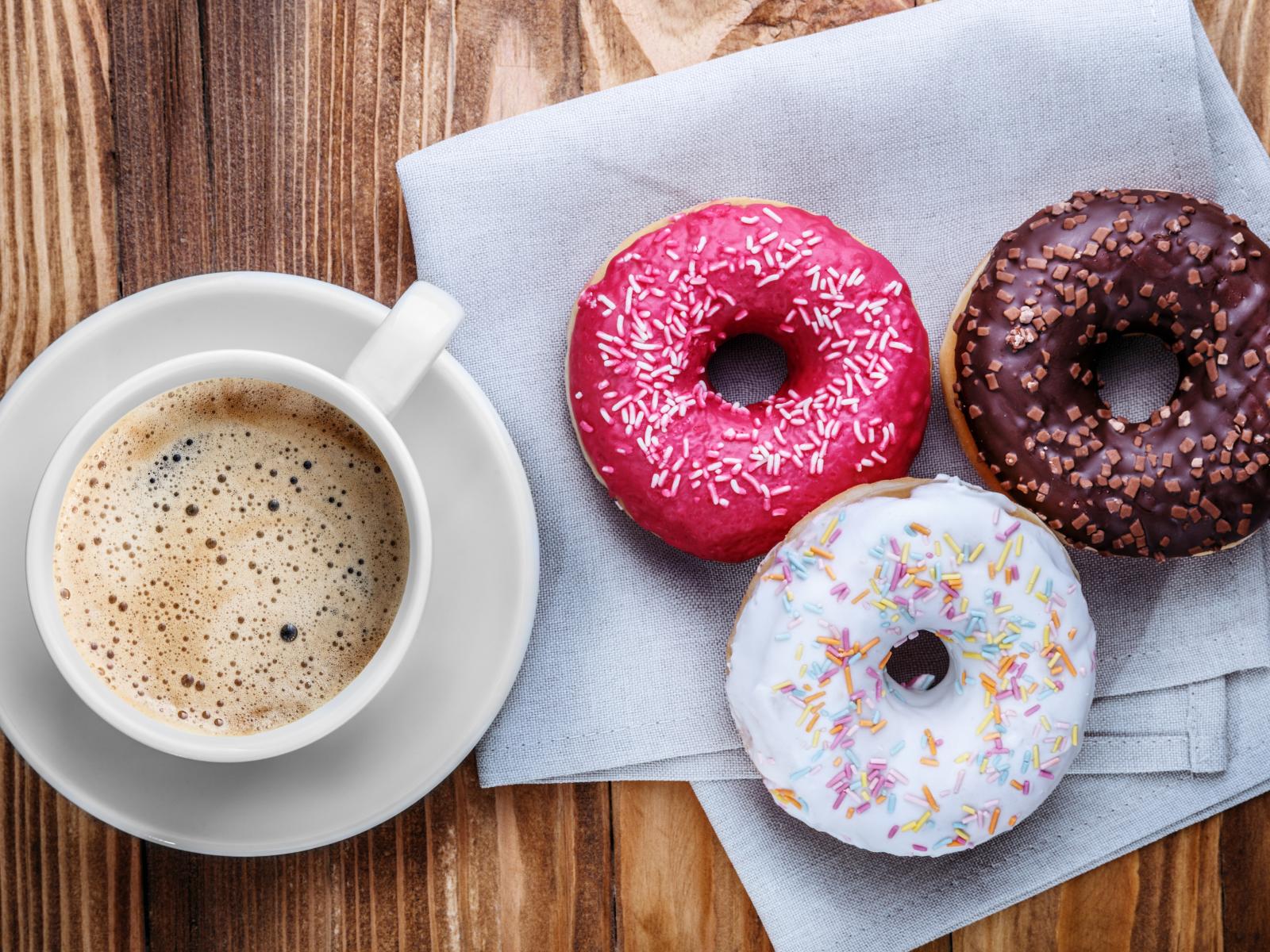 Wallpaper A cup of coffee with three appetizing donuts on a table