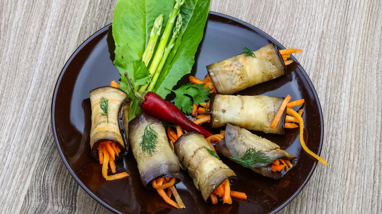 Wallpaper Eggplant rolls with carrots on a plate with lettuce leaves