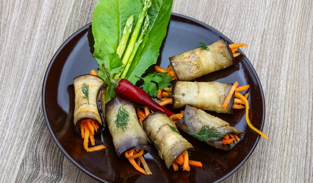 Wallpaper Eggplant rolls with carrots on a plate with lettuce leaves