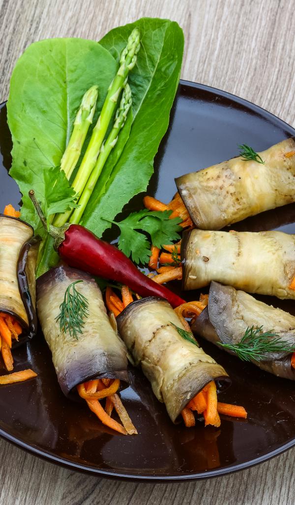 Wallpaper Eggplant rolls with carrots on a plate with lettuce leaves