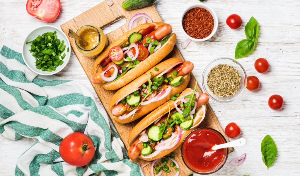 Wallpaper Appetizing Hotdogs on a cutting board with vegetables