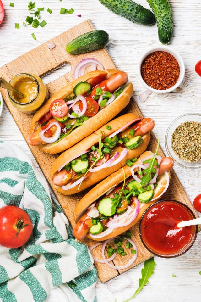 Wallpaper Appetizing Hotdogs on a cutting board with vegetables