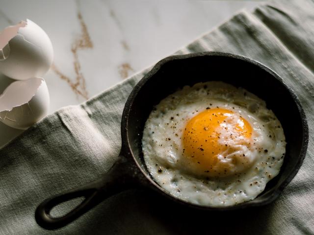 Wallpaper Fried eggs on a table in a small frying pan