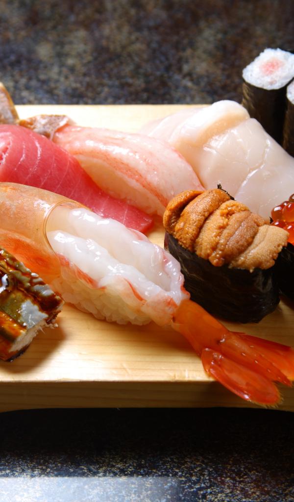Wallpaper Japanese sushi on a wooden board with seafood