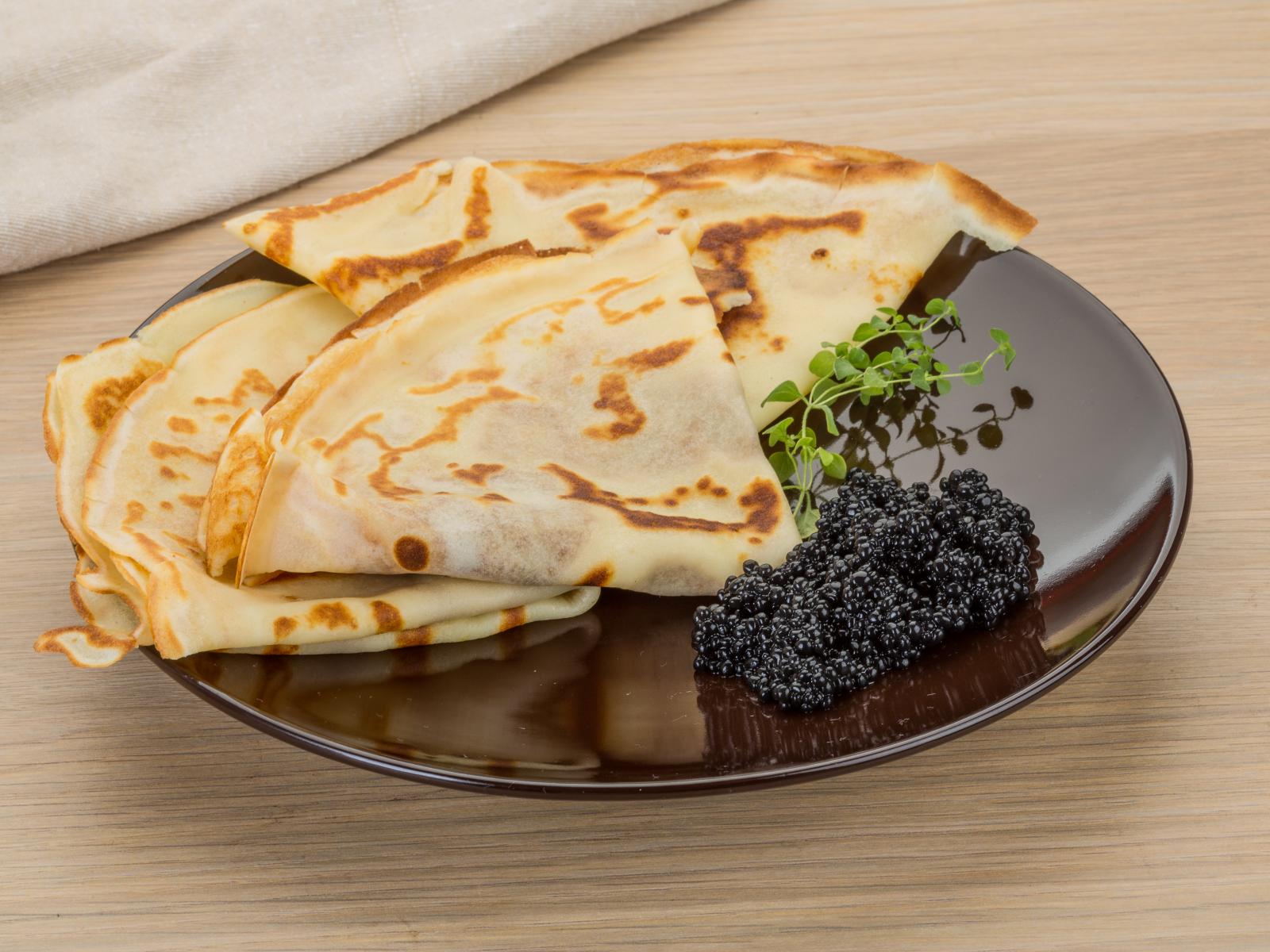 Wallpaper Thin pancakes on a plate with black caviar