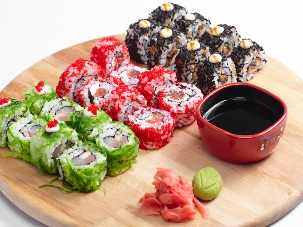 Wallpaper Different appetizing sushi on a wooden board with soy sauce