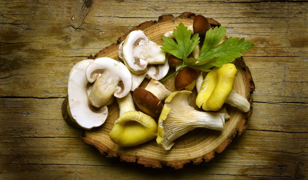 Wallpaper Mushrooms on a wooden cutting board