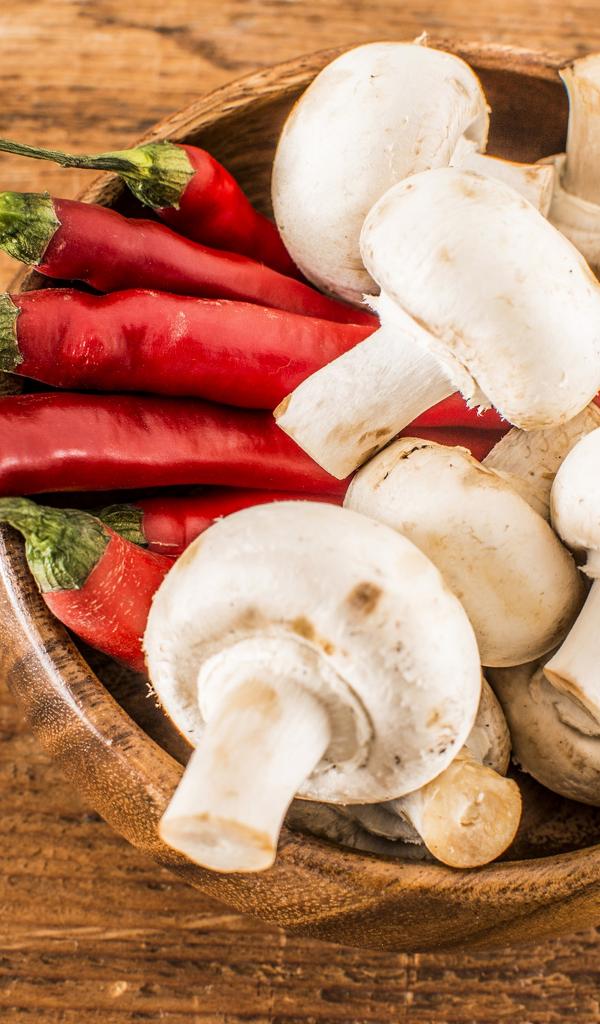 Wallpaper Mushrooms champignons in a wooden bowl with red pepper