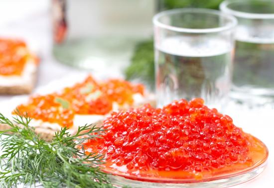 Wallpaper Red caviar with dill on a festive table