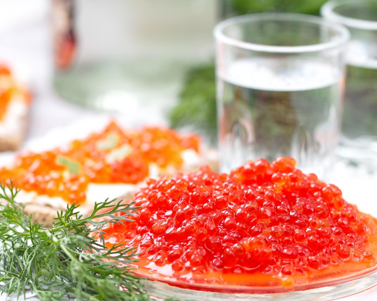 Wallpaper Red caviar with dill on a festive table