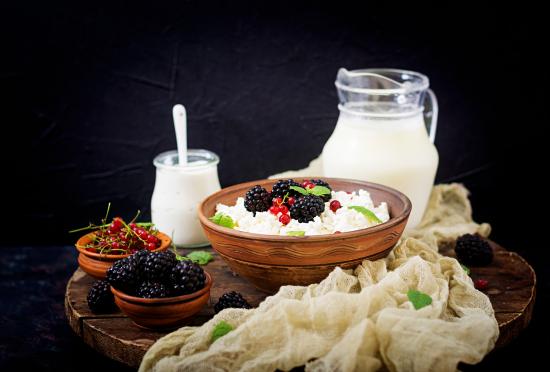 Wallpaper Cottage cheese with blackberries, red currants and milk for breakfast