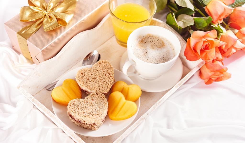 Wallpaper Breakfast for your beloved with a bouquet of roses and a gift